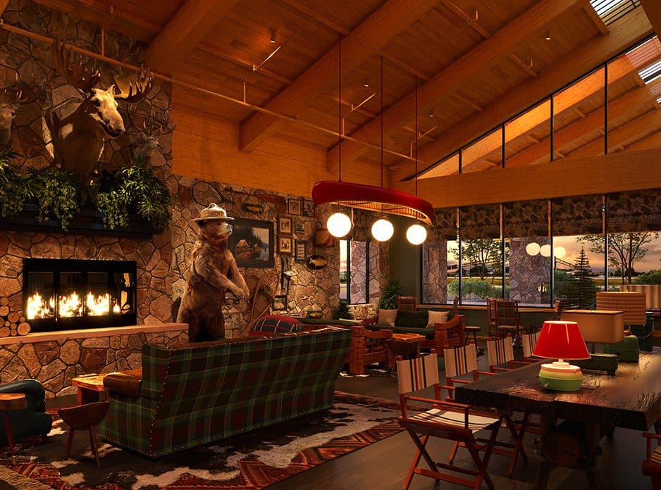The Great Room is the heart of the Lodge with its large stone fireplace, ample seating, board games, and layered finishes inspired by traditional hunting and fishing lodges.